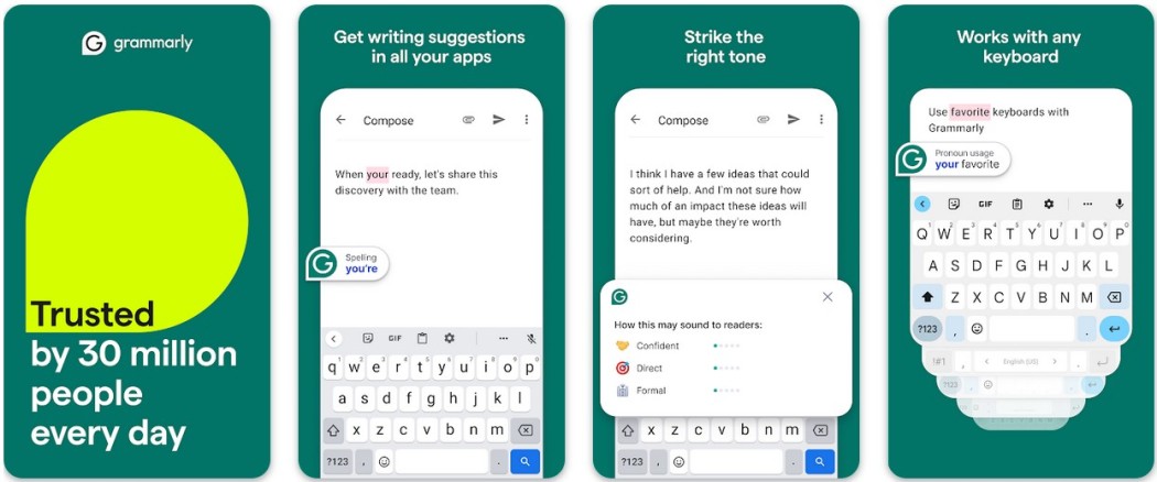 Grammarly offers a dedicated mobile app and is integrated as a Grammarly keyboard, and works as a writing assistant on Android smartphones and tablet devices. It is primarily an AI-driven grammar engine designed to correct typos, suggest tone adjustments, and refine phrases to enhance clarity and conciseness in your content or message.