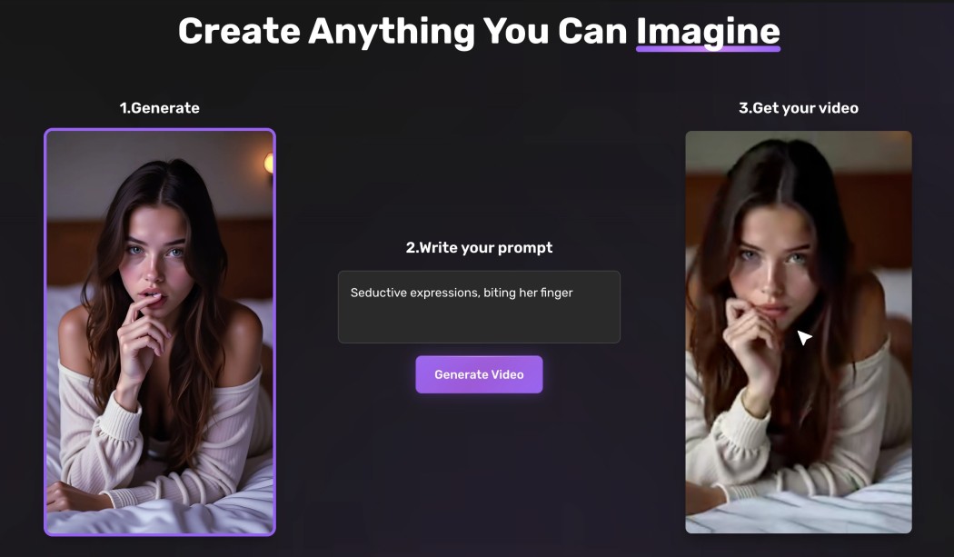 This online video generator tool has absolutely transformed how we generate and create videos. It can turn ordinary images and headshots into short, realistic videos with alluring facial expressions and natural body movements, while adding a sensual, adult-themed atmosphere and smooth camera movements.