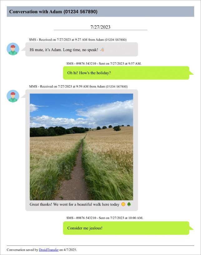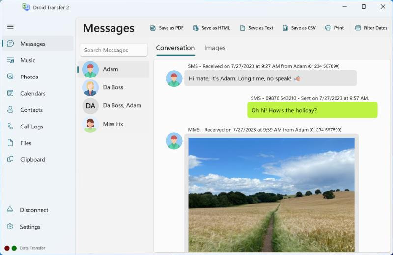 Droid Transfer can save both SMS and MMS messages, along with their attachments, such as photos, videos, and emojis. Each message is exported with full date and time stamps as well as the contact names and numbers for clear, accurate records.