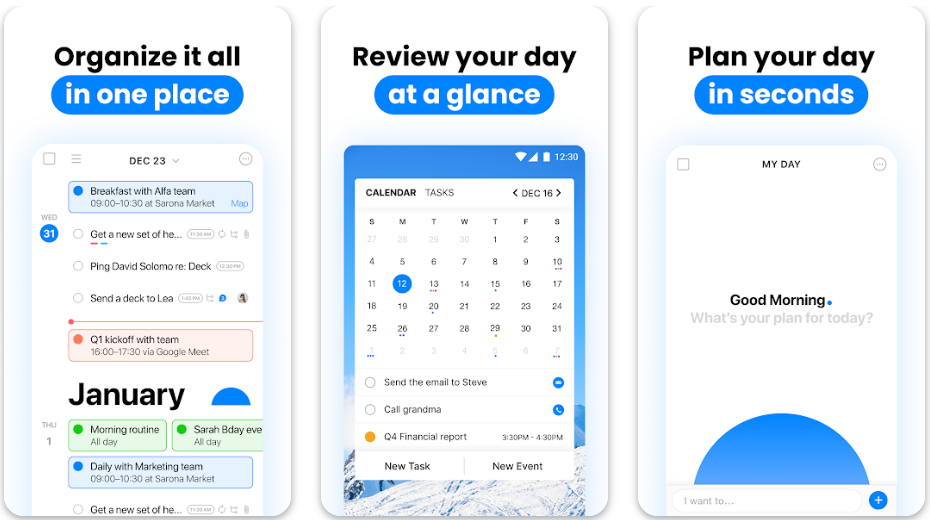 ⭐️ The Good: It brings your to-do lists and calendar events into one unified view. It features a great “Plan my Day” tool that forces you to review your tasks every morning, plus location-based reminders (e.g., “Remind me to buy milk when I get near the grocery store”).
