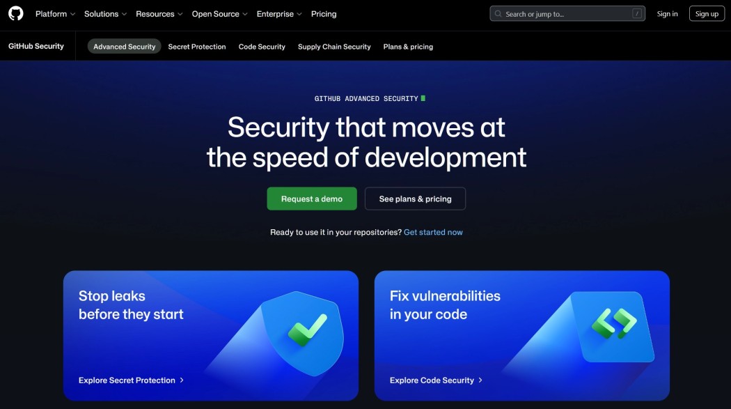GitHub Advanced Security (GHAS) brings SAST, SCA, and secrets detection directly into the GitHub platform for teams running GitHub Enterprise. CodeQL, the SAST engine, runs as part of the pull request workflow and flags issues before code merges. Secret scanning monitors repositories for exposed credentials and can block pushes containing known secret patterns.