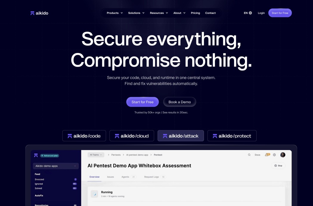 Aikido is an all-in-one AppSec platform that bundles SAST, SCA, DAST, IaC scanning, container security, secrets detection, and cloud posture management into a single product. It is a modern application security platform built for teams that want security checks embedded directly in how they develop software.