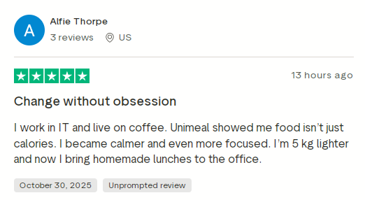 Alfie Thorpe from the USA shared his experience on TrustPilot. His IT job had him surviving mostly on coffee until he discovered this app, which completely changed his routine. Food became more than just calories, and he successfully lost 5 kg. With his new habit of having home-prepared lunches, his calmness and focus improved consistently.