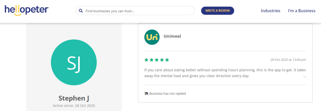 - Stephen J posted on HelloPeter and wrote that the app helped him to eat better without planning. Mental load disappears while a clear daily direction guides him toward healthier choices.