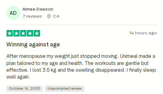 - In TrustPilot, Canadian Aimee Dawson shared her user story and experience of difficulties in post-menopause. Weight loss stopped completely until Unimeal created age-appropriate, health-tailored plans entirely. Gentle yet effective workouts helped her lose 3.5 kg while eliminating swelling. These remarkable physical advances she had were accompanied by quality sleep bouncing back.