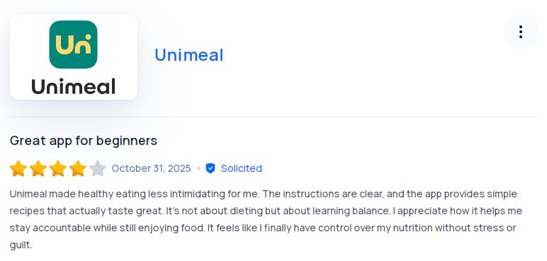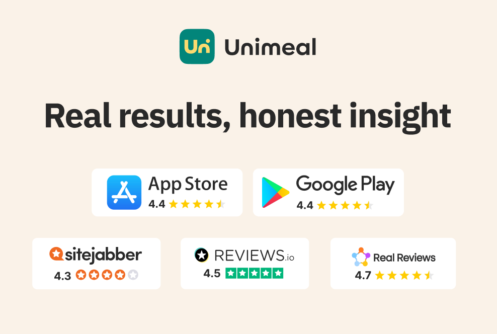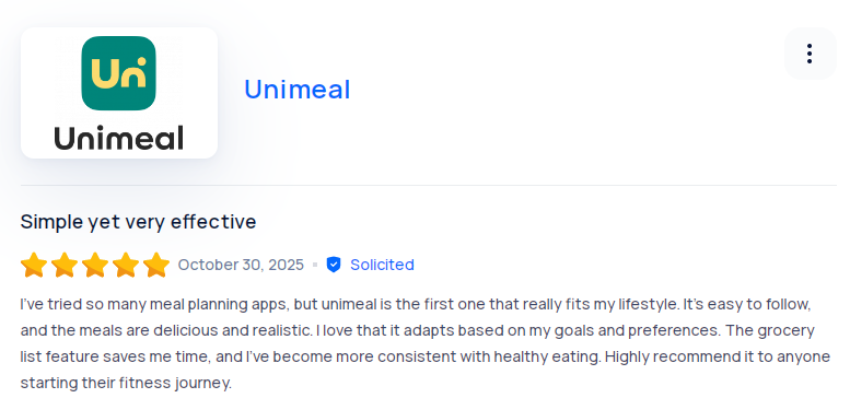 - Regina G. reviewed Unimeal on SiteJabber, giving it a positive rating and praising it as a top meal-planning app. The easy-to-follow, realistic meals helped her build sustainable healthy habits, while the grocery list feature saved time. She strongly recommends Unimeal for anyone starting their fitness journey.