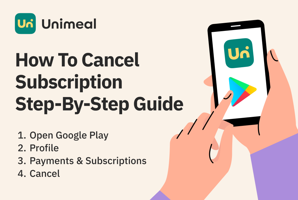 Android users can open Google Play, then access Profile settings to begin cancellation. The Payments and Subscriptions section contains Unimeal, where cancellation options appear clearly. Selection and confirmation complete the process without any unexpected issues arising anywhere.