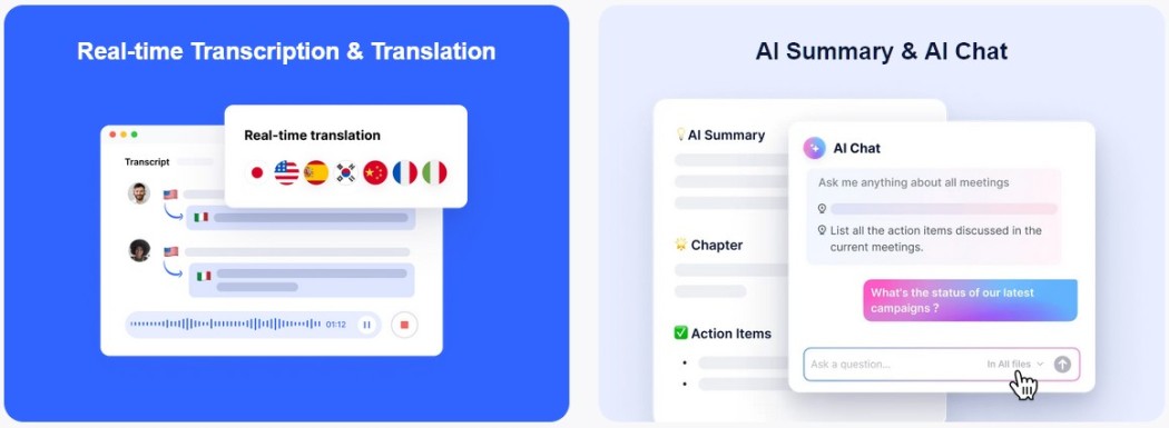 - It’s smart. AI summaries, action items, searchable transcripts, and an in-app chat that pulls up precisely what you need.