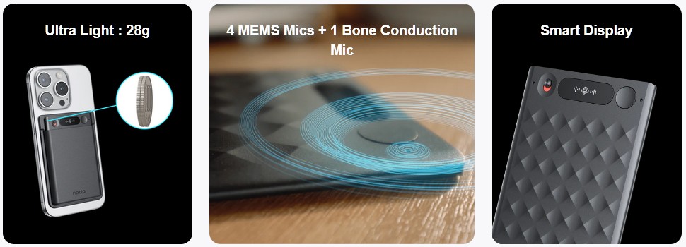 Let’s begin with the hardware. Notta Memo weighs just 28 grams, roughly equivalent to five nickels. It’s small enough to disappear into your pocket, but smart enough to capture crystal-clear audio using a 4-mic array with bone conduction mic technology, which means the device is capable of recording phone calls directly through vibration, not just air.